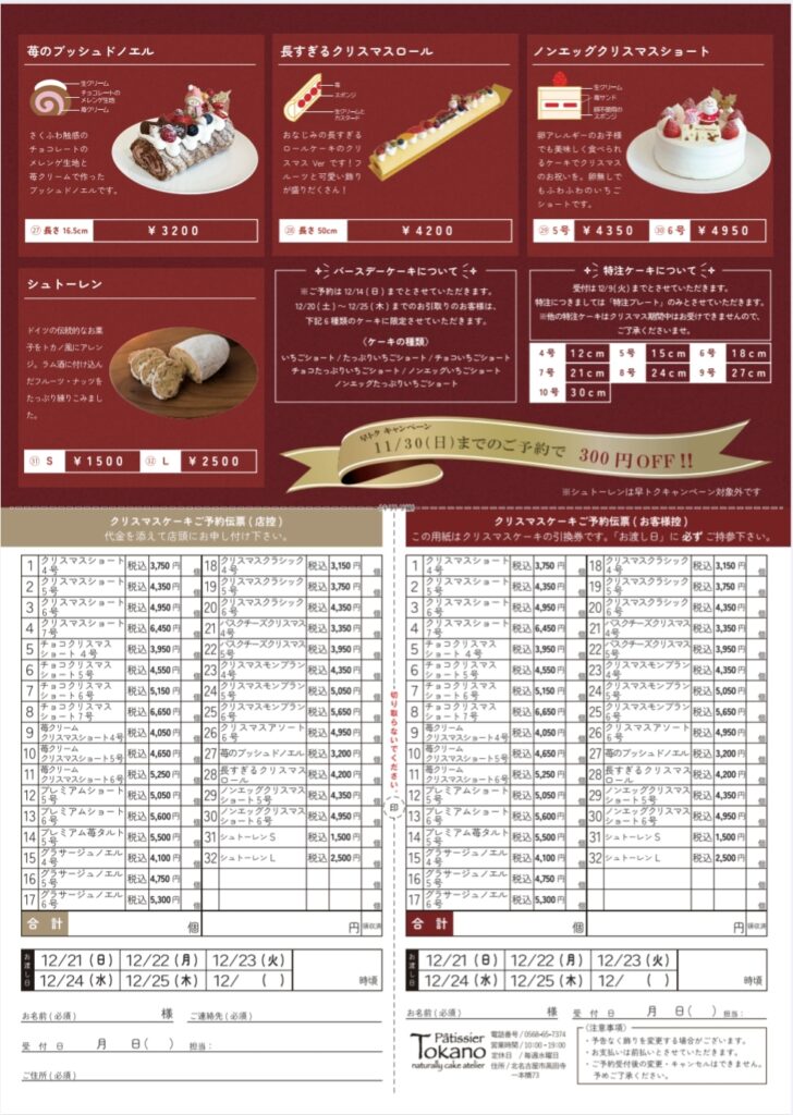クリスマスケーキの予約受付は11月1日スタート!11月中のご予約で300円引きの早トクキャンペーンもあります!みなさまのご予約をお待ちいたしております!